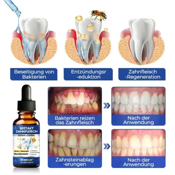 “Früher war mein Zahnfleisch fast jedes Mal, wenn ich mir die Zähne putzte, geschwollen und schmerzte, und ich machte mir zunehmend Sorgen, da es langsam zurückging. Ein Freund empfahl mir Biancat® BeeTakt Oral Repair Solution, also habe ich es vor etwa einer Woche in meine tägliche Routine aufgenommen. Die Verbesserung trat schnell ein – innerhalb weniger Tage ging die Schwellung deutlich zurück und die Empfindlichkeit beim Essen war fast vollständig verschwunden. Nach regelmäßiger Anwendung fühlt sich mein Zahnfleisch viel stärker an als zuvor, und ich bin endlich zuversichtlich und beruhigt, da ich weiß, dass sich die Gesundheit meines Zahnfleisches verbessert.”