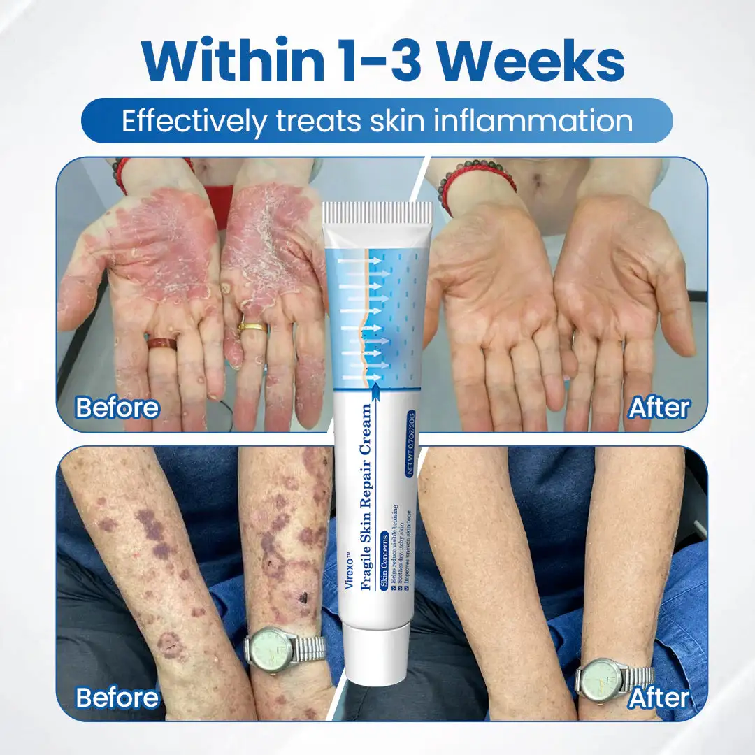 It’s not just “getting older.” Over time, your skin becomes thinner, weaker, and less able to protect and repair itself. Virexo™ Fragile Skin Repair Cream is designed to support fragile, aging skin by helping reduce the appearance of bruising, soothe dry itchy skin, and improve overall skin tone and texture.